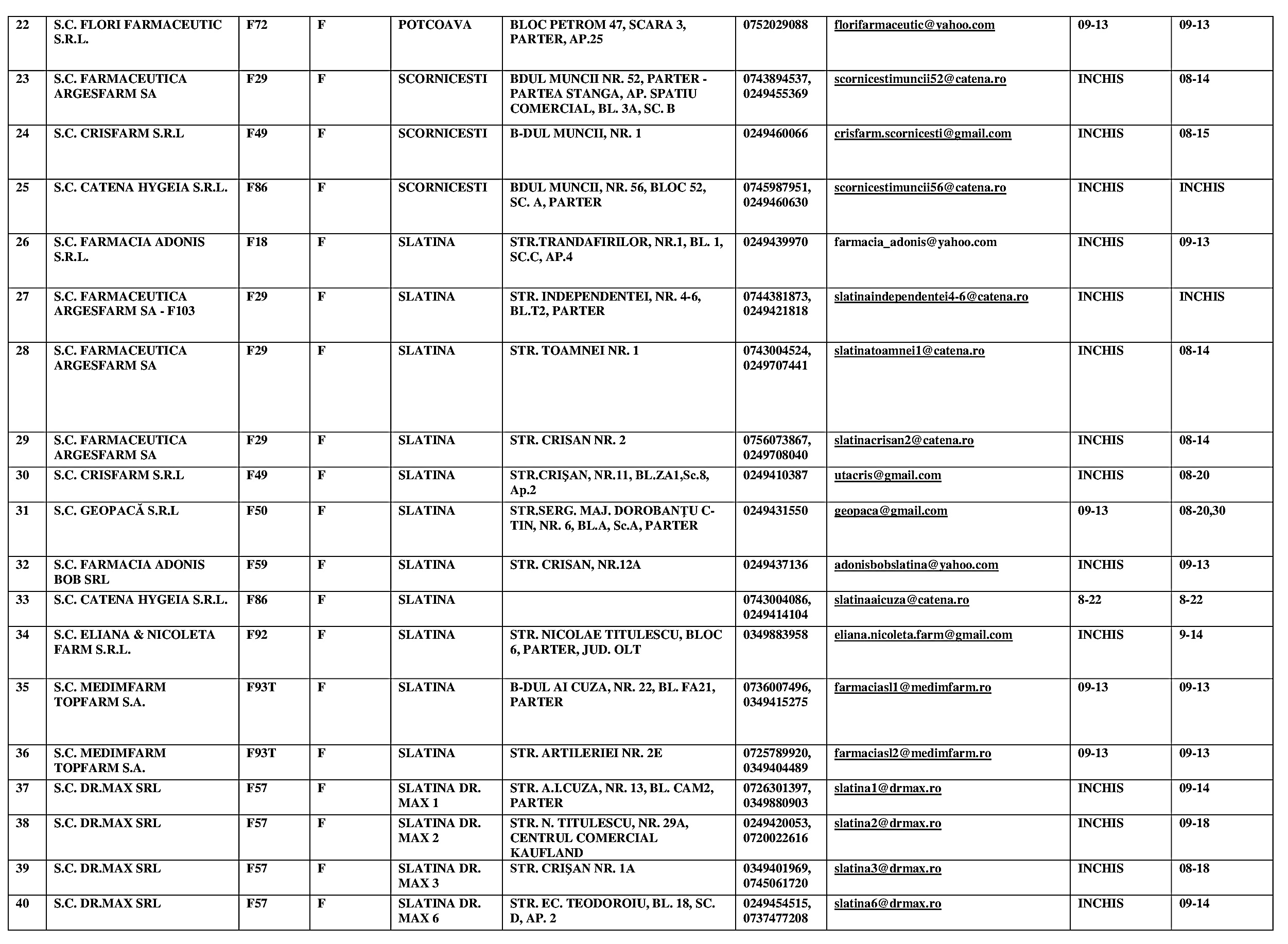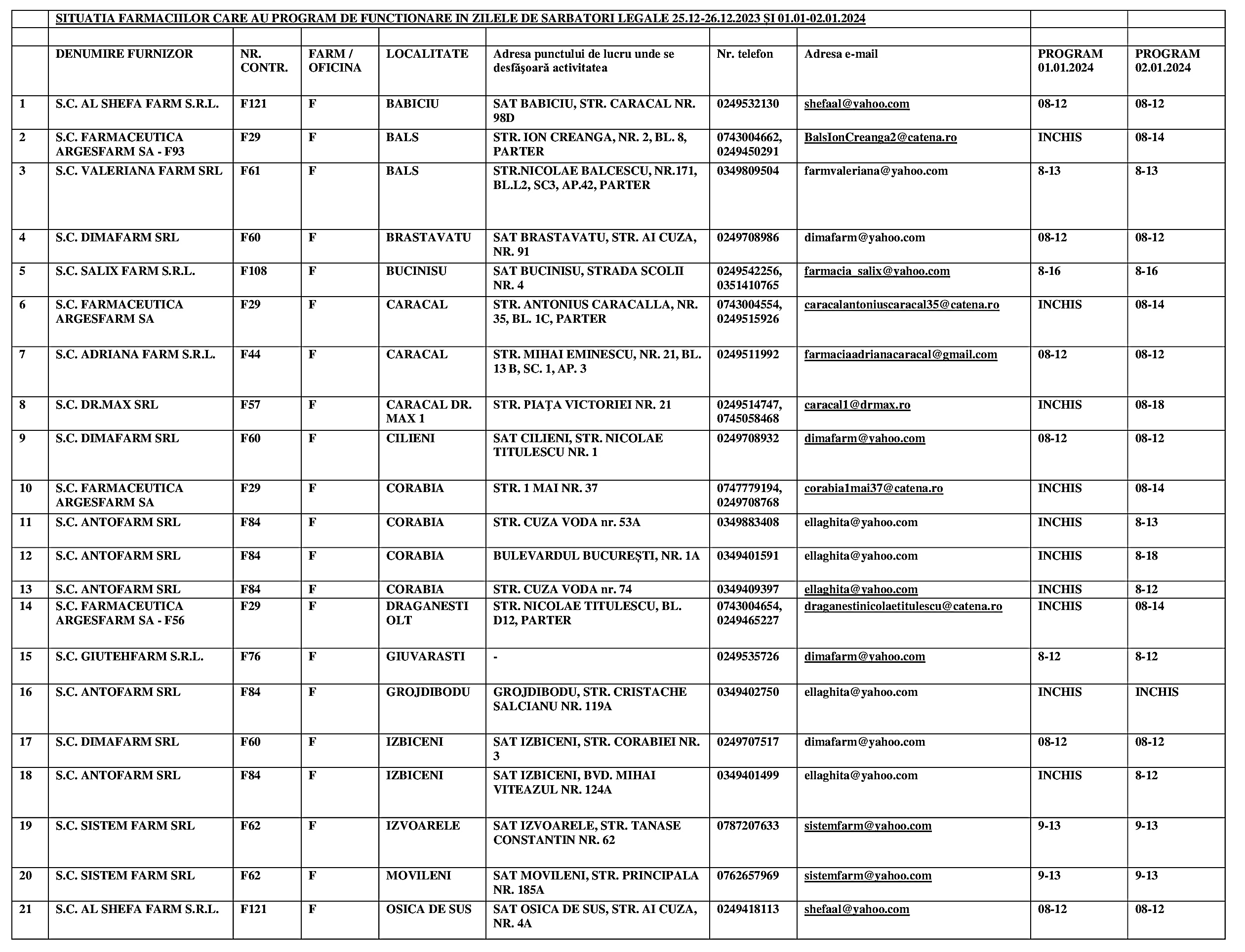 Iată lista cu toate farmaciile din judeţul Olt, care vor asigura permanenţa în prima şi a doua zi din 2024.