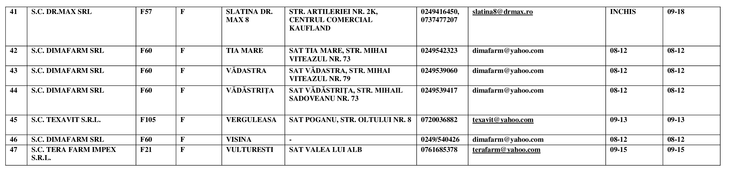 În Slatina, în noaptea dintre ani, cu începere de la ora 22:00 a ultimei zile din an până la ora 07:30, farmacia Dr. Max, de pe strada Trandafirilor, bl.. 5, sc. C, ap. 4, vis-a-vis de Spitalul Județean de Urgență Slatina, va asigura permanenţa. Acelaşi lucru îl va face şi în noaptea de 1 spre 2 ianuarie 2024.