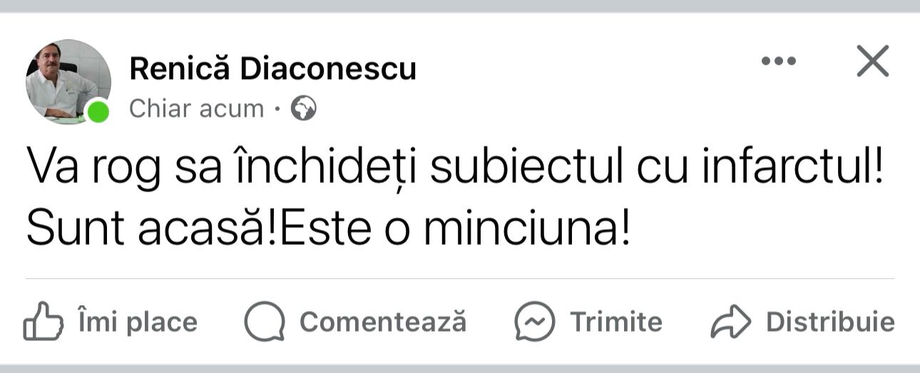 „Vă rog să închideți subiectul cu infarctul! Sunt acasă! Este o minciună!”, spune doctorul pe pagina sa de Facebook.