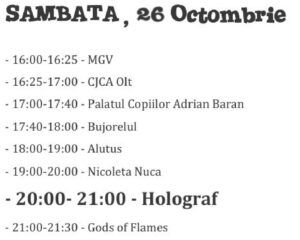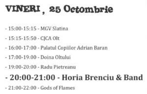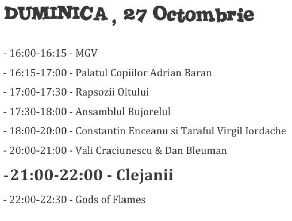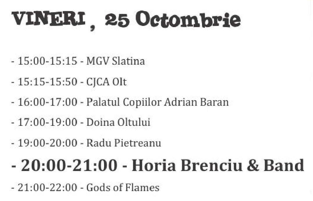 „Momente artistice – Copiii talentați de la Palatul Copiilor Adrian Băran, Centrul Județean de Cultură și Artă Olt și Clubul de dans modern MGV Slatina vor aduce pe scenă dansuri tradiționale și moderne care vă vor cuceri inima. Vor urca pe scenă artiști consacrați, printre care Horia Brenciu & Band și Clejanii, care vor aduce un show plin de energie și voie bună! Descoperă savoarea preparatelor tradiționale oltenești care te vor purta într-o călătorie culinară de neuitat! Parcul Tineretului se va transforma într-un spațiu plin de culoare, veselie și bucurie, unde oamenii vin să celebreze tradițiile și să se bucure împreună de magia toamnei! Nu rata acest festival unic, care adună laolaltă olteni și oameni din toate colțurile lumii! Vino să te bucuri de 3 zile de distracție, muzică, dans și bunătăți tradiționale”, transmit reprezentanţii primăriei.