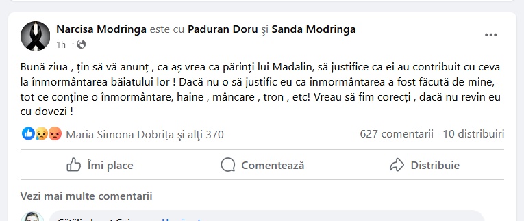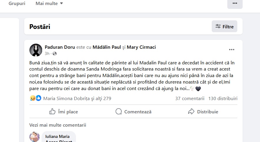 „Bună ziua, țin să vă anunț, în calitate de părinte al lui Madalin Paul, care a decedat în accident, că în contul deschis de doamna Sanda Modrîngă, fără solicitarea noastră şi fără să vrem, a creat acest cont pentru a strânge bani pentru Mădălin, acești bani care nu au ajuns nici până în ziua de azi la noi, ea folosindu-se de această situație neplăcută şi profitând de durerea noastră cât și de el. Îmi pare rău pentru cei care au donat bani in acel cont crezând că ajung la noi…”, se arată în postarea tatălui lui Mădălin.