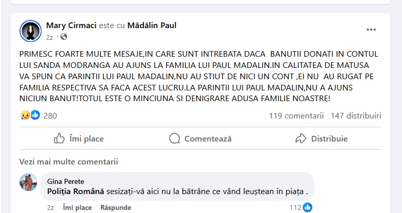 „Primesc foarte multe mesaje în care sunt întrebată dacă bănuţii donaţi în contul lui Sanda Modrânga au ajuns la familia lui Paul Mădălin, în calitatea de mătuşă vă spun că părinţii lui Paul Mădălin nu au ştiut de nici un cont, ei nu au rugat pe familia respectivă să facă acest lucru. La părinţii lui Paul Madalin nu a ajuns niciun bănuţ! Totul este o minciună şi denigrare adusă familie noastre!”, spune Mari Cîrmaci.