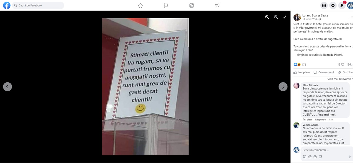 Toate televiziunile şi site-urile de ştiri au promovat imagine a unui afiş care ar aparţine unui restaurant din Eforie Nord. Fără nicio sursă credibilă, întreaga presă a viralizat imaginea momentului, care conţine textul: „Stimați clienți! Vă rugăm să vă purtați frumos cu angajații noștri, sunt mai greu de găsit decât clienții”.